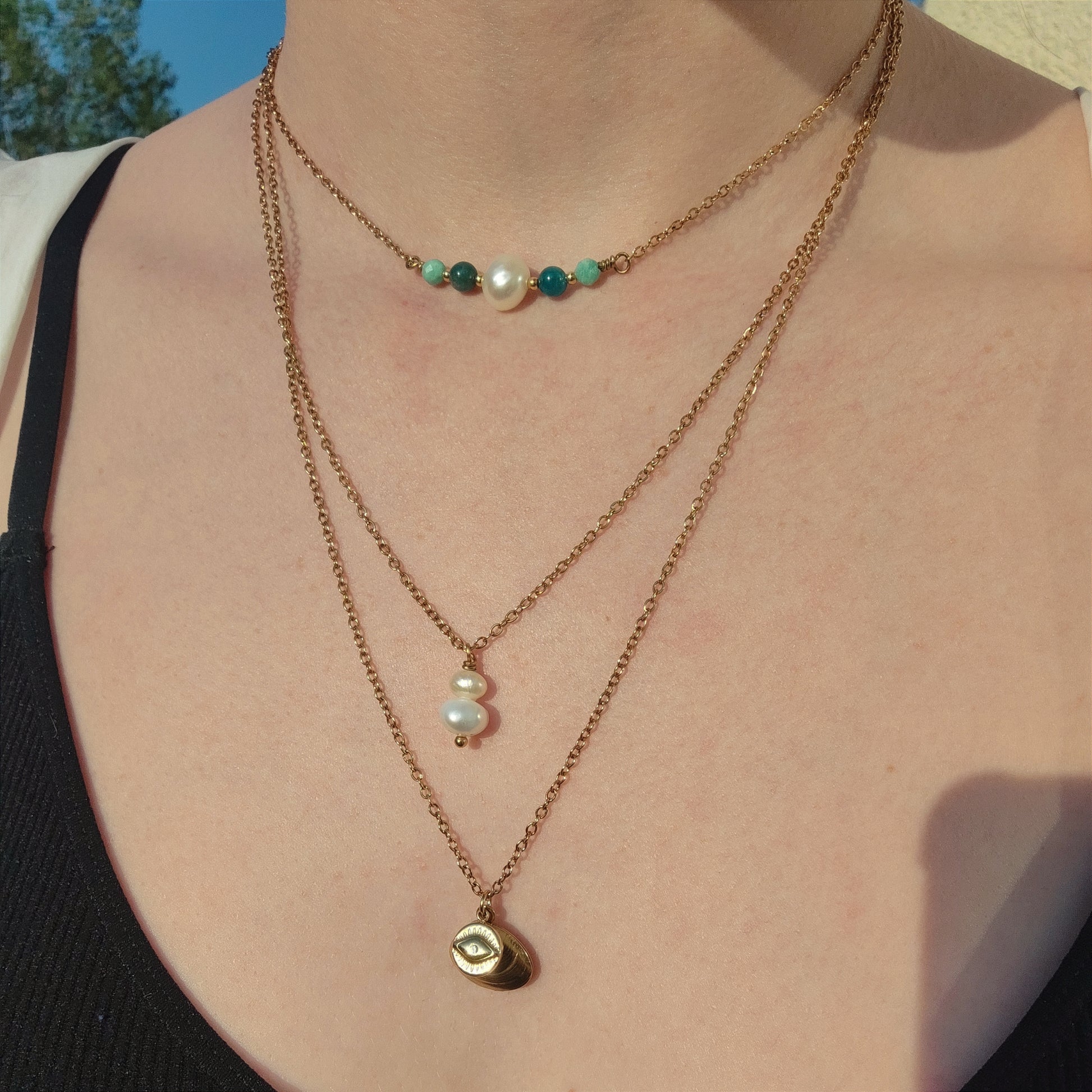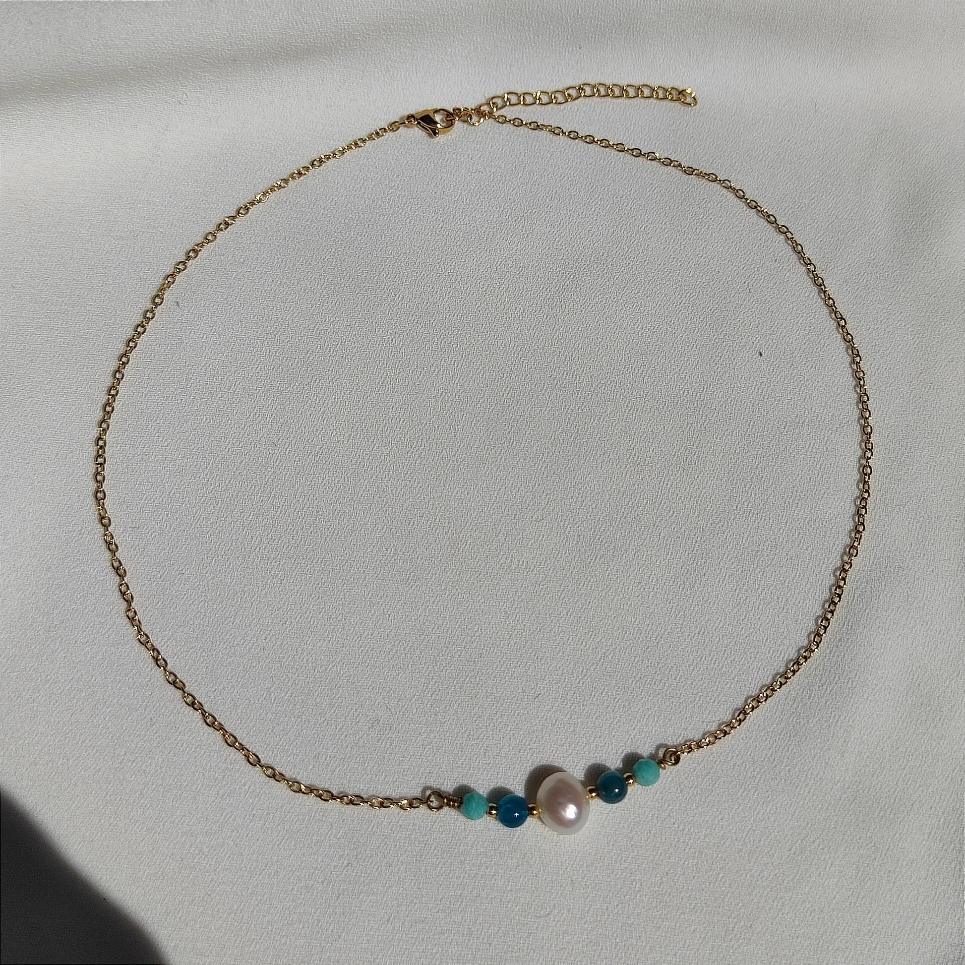 Le collier Calie est composĂ© d'une chaĂ®ne en acier inoxydable et perles en pierre naturelles : Amazonite, Apatite, perle de culture vĂ©ritableÂ