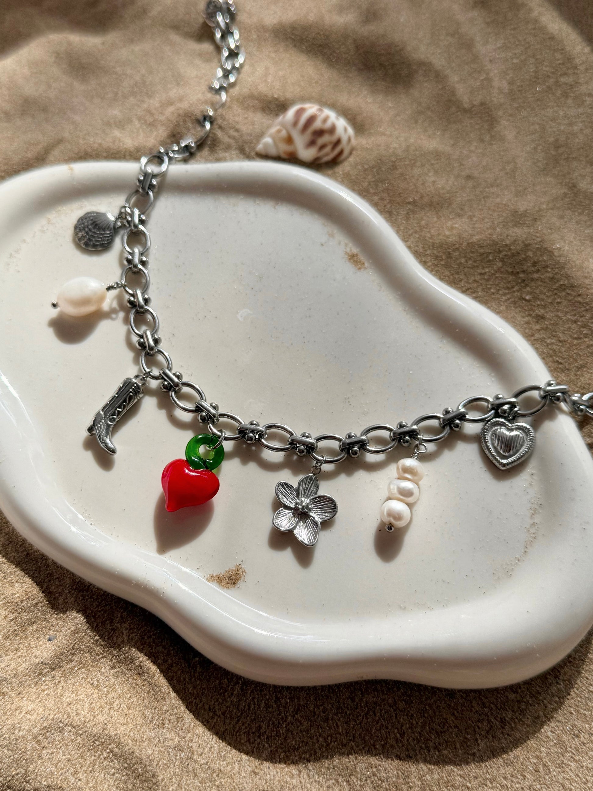 Le collier Carlota est en acier inoxydable, perle de culture véritable et breloque en verre ( le cœur rouge )