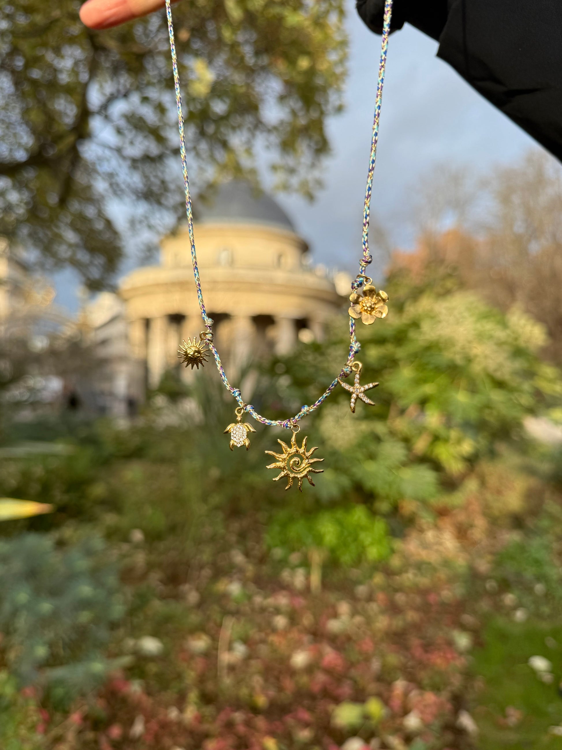 Le collier Gloria est en fil de nylon tressé et breloques en acier inoxydable.